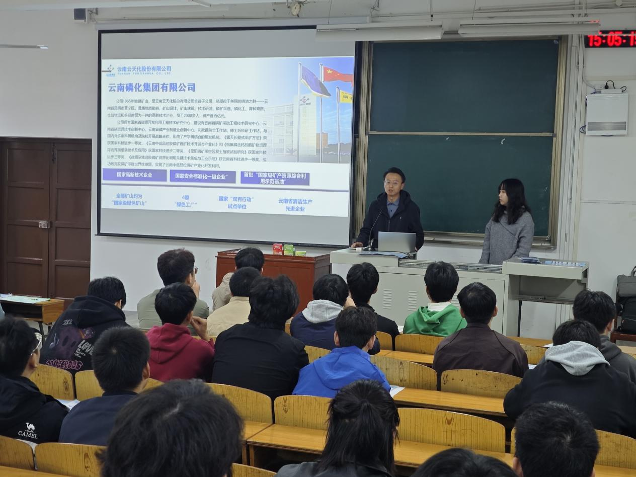 讲座中,宋岩结合个人学业与职业发展经历,系统介绍了云天化集团的岗位需求、准入门槛、职业发展路径及未来成长空间,引导同学们在专业背景下开展职业自我认知与科学规划,深化了学生对行业前景和个人定位的理解。