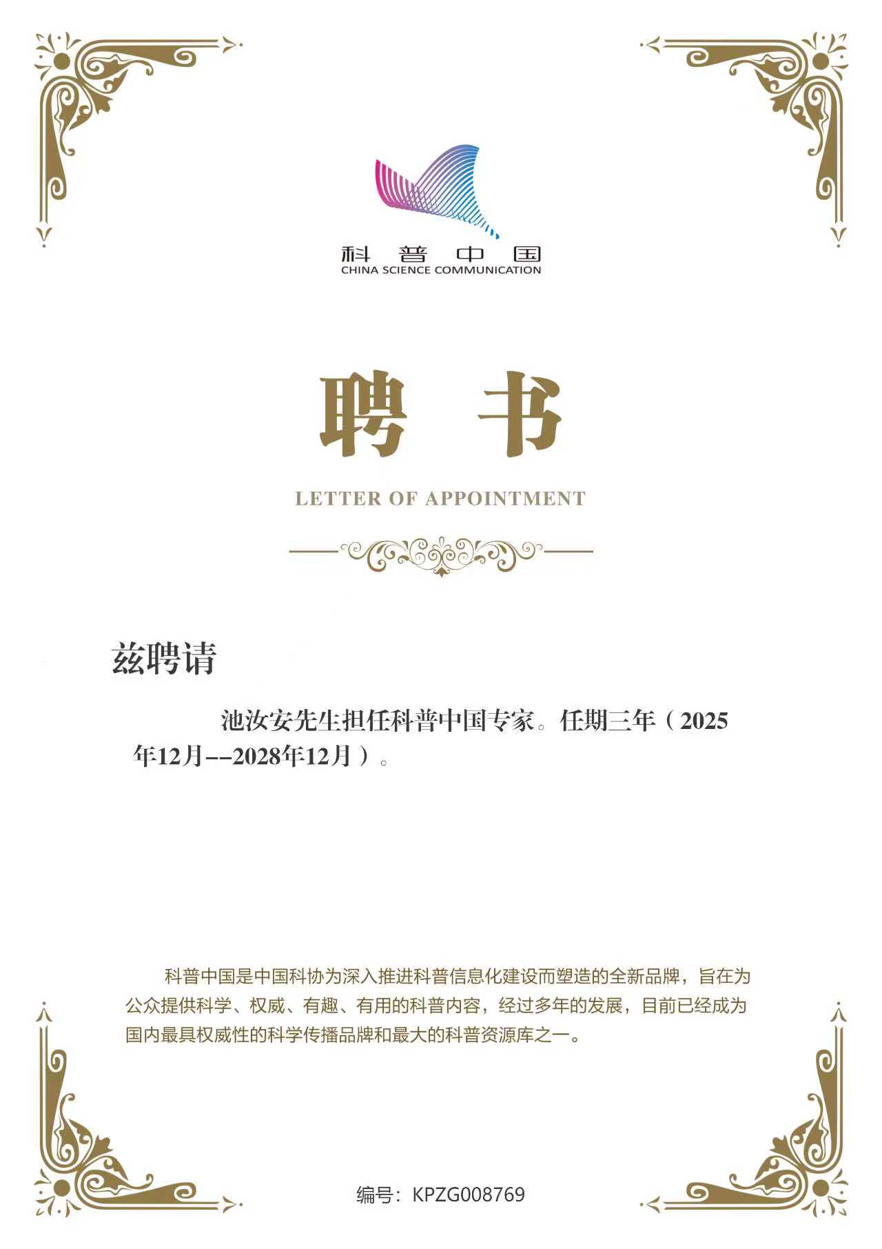 2025年5月25日,池汝安教授带领团队在北京广播电视台开讲——《稀土——开启可持续未来的密码》,揭开了稀土这一“战略元素”的神秘面纱,也与科普中国结下了深厚的缘分。受聘为“科普中国专家”,既是一份崇高的荣誉,更是一份沉甸甸的责任。科学普及与科技创新是实现创新发展的两翼,至关重要。池汝安教授将充分利用这一平台,紧密围绕国家发展战略与公众关切,在稀土资源主题上发力,创作更多优质、精准、有趣的科普内容,积极参与各类科普活动,推动科学知识走出象牙塔,帮助公众更好地理解科学前沿动态,助力全民科学素质的持续提升。