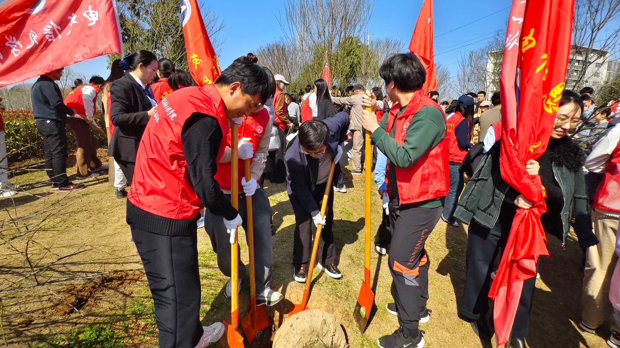 活动现场,师生们分工协作、默契配合,有序完成植树各项工作,现场劳动氛围浓厚。