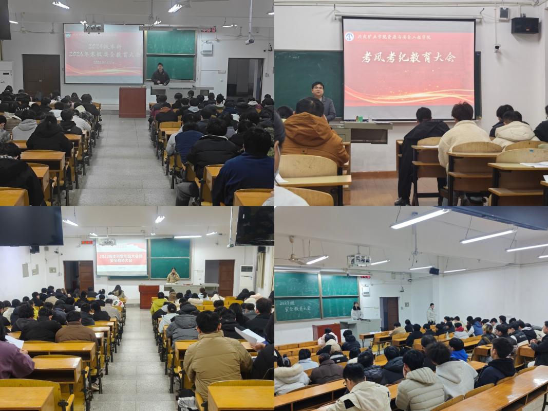 专题教育,强化意识。学院面向各年级集中组织召开寒假安全教育暨考风考纪大会。会议紧密结合冬季高发安全事故与校园典型案例,围绕离校返乡交通安全、宿舍消防用电安全、防范电信网络诈骗等重点领域进行讲解,提升学生风险识别与应对能力。同时,大会严肃强调考风考纪,开展诚信教育,引导学生自觉维护公平公正的学业环境。各班级召开主题班会,进一步深化教育实效。