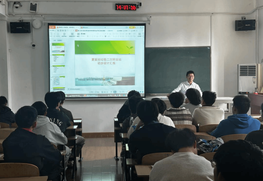 本网讯(通讯员 梁欢) 2025年10月29日下午,武汉工程大学资源与安全工程学院校企合作课程《矿物材料》的最后一堂课在二教2508成功举行。根据课程教学安排,本次特邀中铁十一局第五工程有限公司高级工程师黄斯铭走进课堂,以“夏家坝垃圾二次转运站”这一大型市政工程为鲜活案例,为同学们带来了一场连接理论知识与工程实践的深度讲座。