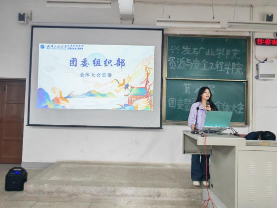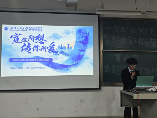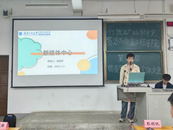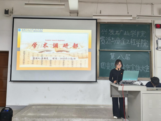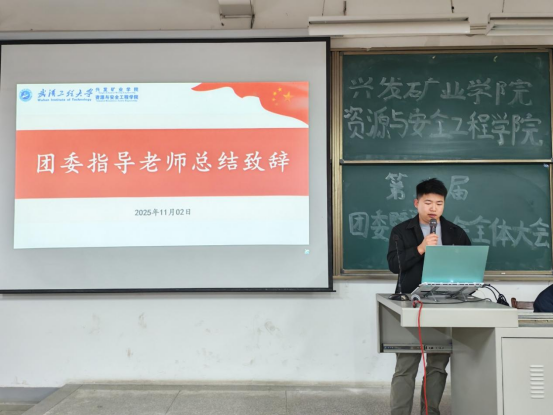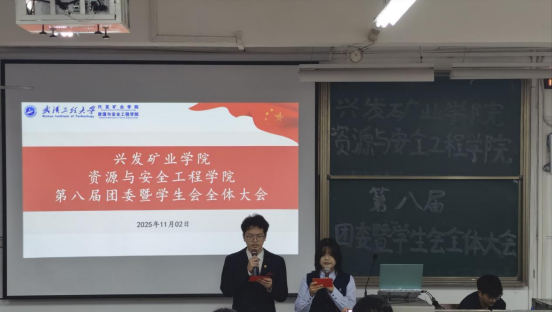 本网讯(通讯员 耿胡锐 周榴谦)为明确新学期团学工作方向,凝聚青年学子力量,11月02日晚,兴发矿业学院资源与安全工程学院第八届团委暨学生会全体大会在武昌校区W2102教室隆重召开。学院团委指导老师耿胡锐、2025级辅导员王祥祥、学生团委副主席王艺樨、主席团成员高雅思,第八届团委暨学生会全体成员参加了此次活动。