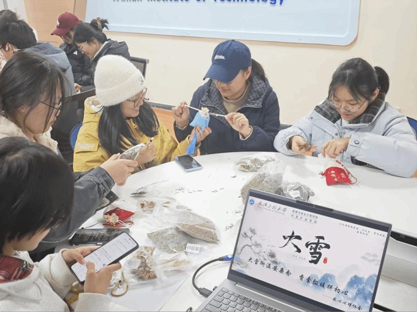 本网讯(通讯员 王耀眉 王睿玲)为传承中华优秀传统文化,丰富学生课余生活,缓解学业压力,12月8日,学院安心心理协会成功举办“药香沁心脾 大雪润心灵”传统文化系列手工活动。十余位同学齐聚一堂,在亲手制作中感受传统魅力,收获内心宁静。