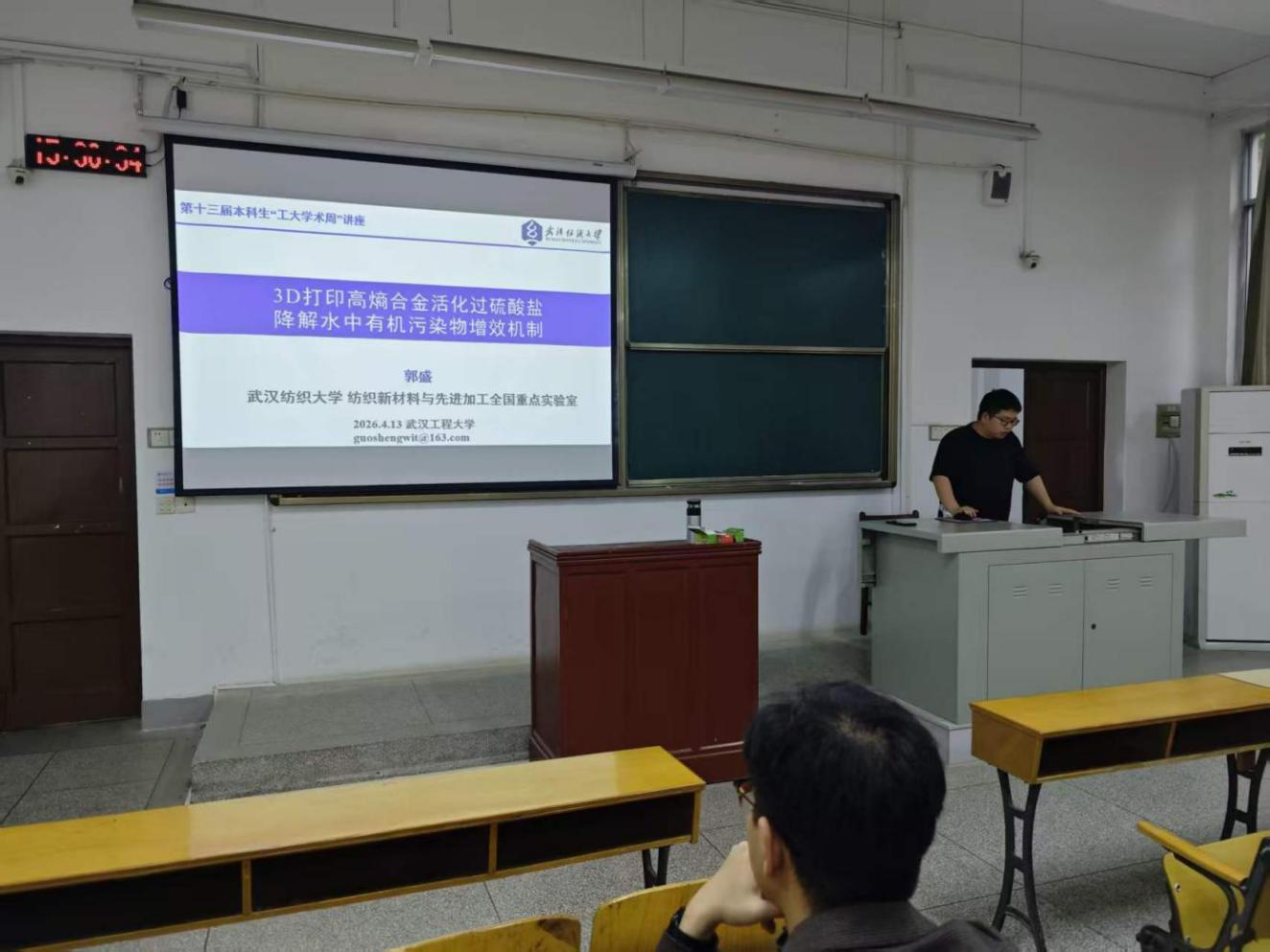 (通讯员 梁欢)为拓宽师生学术视野,推动学科交叉领域创新发展,2026年4月13日,我校第十三届本科生“工大学术周”系列学术讲座顺利举办。武汉纺织大学纺织新材料与先进加工全国重点实验室郭盛教授受邀莅临资源与安全工程学院,以《3D打印高熵合金活化过硫酸盐降解水中有机污染物增效机制》为题作专题报告,为相关专业师生带来一场兼具前沿性与专业性的学术分享。